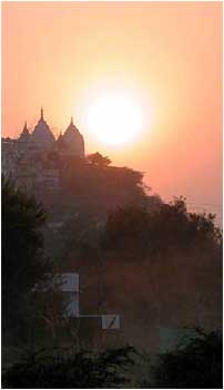 I worship the most enchanting abode of Sri Vrindavana, which is made fragrant by the lotus feet of the adolescent Divine Couple, Radha and Krishna, who are surrounded by many laughing and joking girlfriends, who are very expert all varieties of arts of the amorous play. In Vrindavana, the Divine Couple passionately sports day and night in the forest groves surrounded by trees, vines and fresh leaves, as well as in the caves of its mountains."